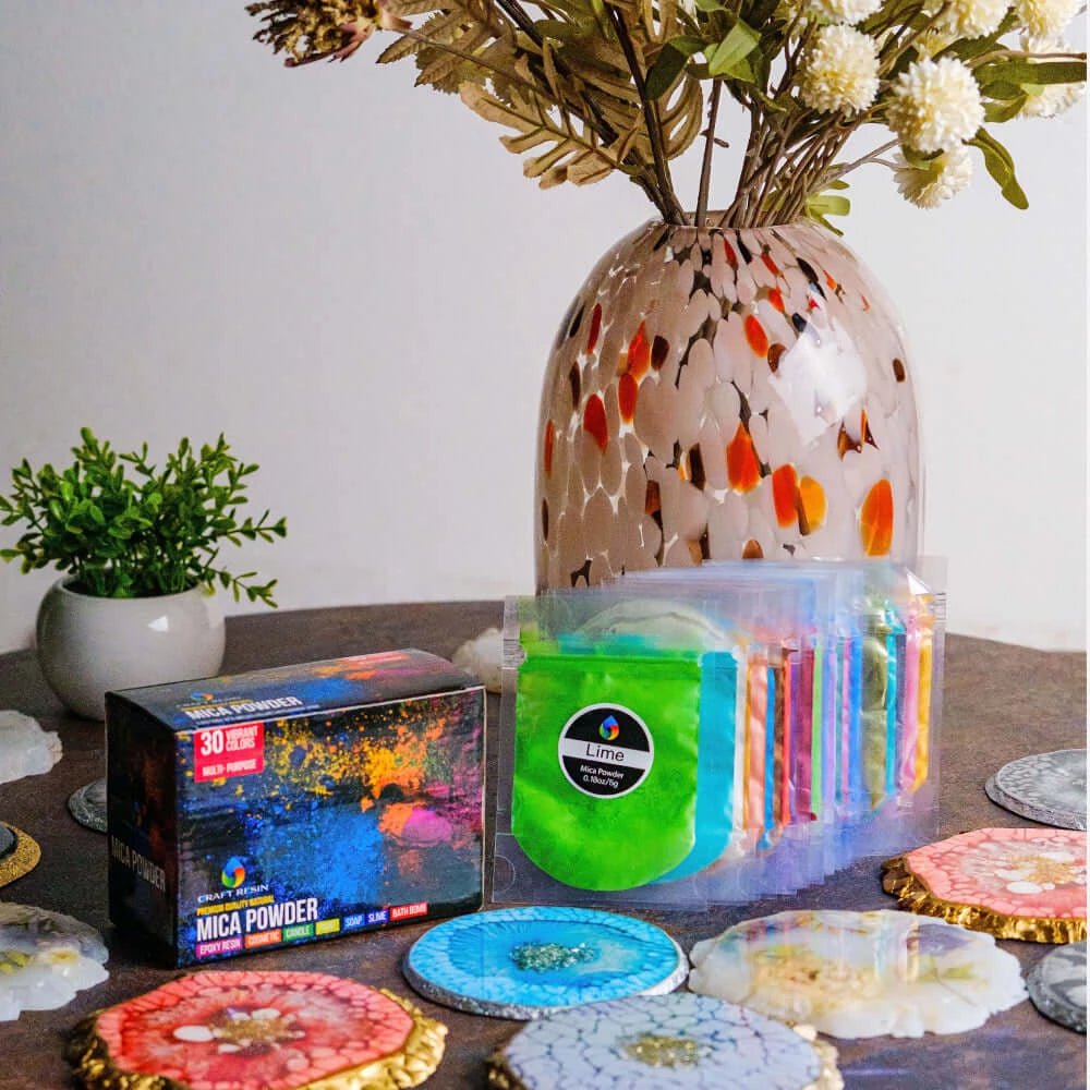 Inspired by nature, powered by pigment—this curated collection of mica powders brings sophistication and shine to every pour. Set beside blooming resin coasters and floral vases, it’s a glimpse into what’s possible when colour meets craftsmanship.